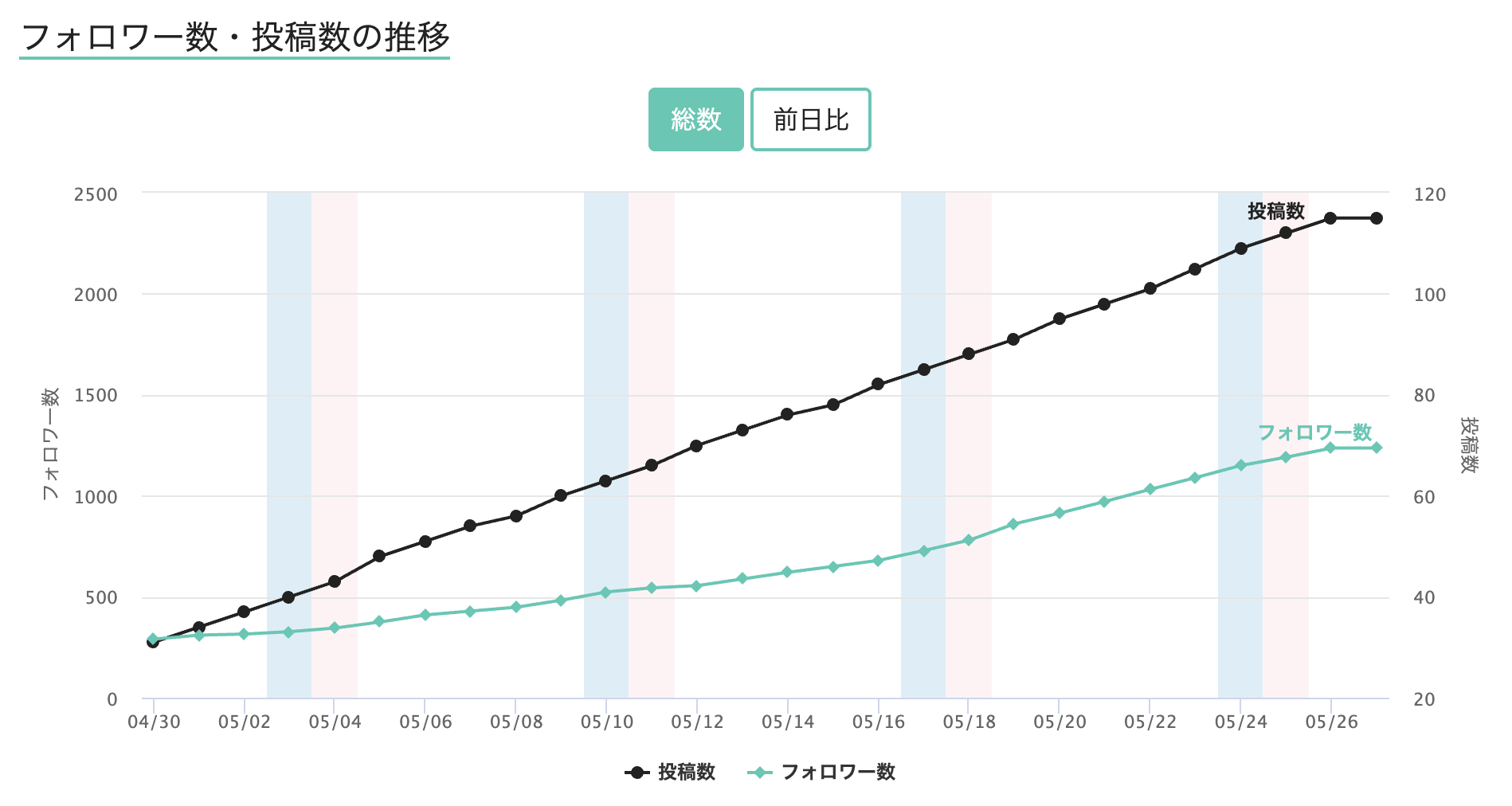 5月16日から伴走グループに参加。グループの仲間達の凄まじい勢いが刺激になったのではないかと思います。5月17日以降は、フォロワー急上昇ランキングも常連となりました。