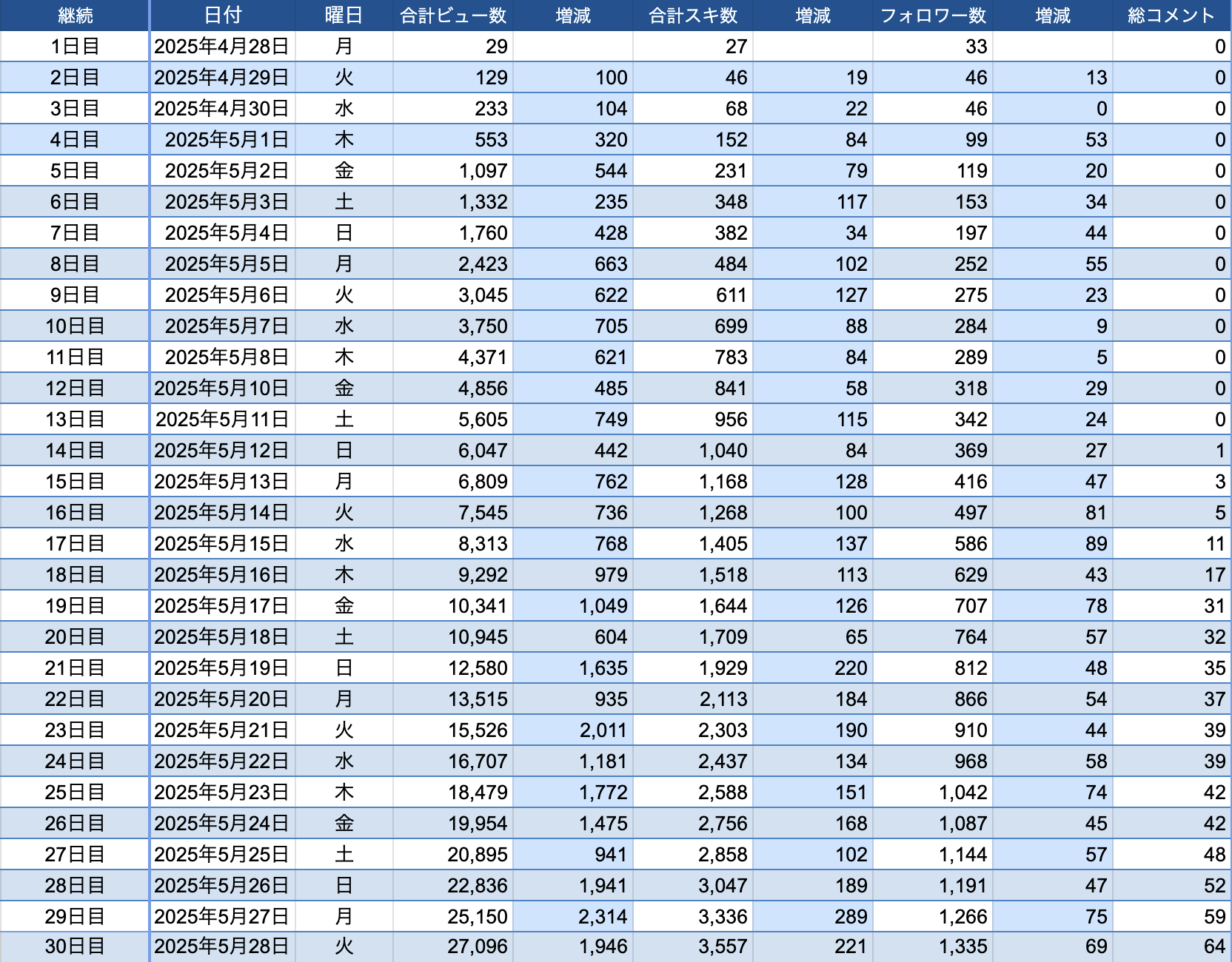 コツを掴んでルーティン化すると、グングンと伸びていく様子がわかります。増減も細かく書いてくれているので、あなたが30日間を実践する上での指標にもなるデータとなっています。こうして細かく記録をして、実践を行動で示してくれているのは、僕にとってとても嬉しい事でした。