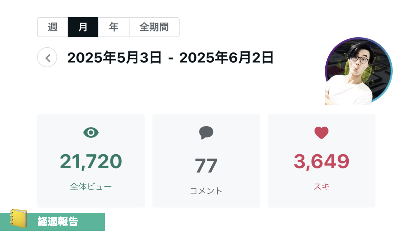 きよせさんは、講義ビデオをしっかりと見てくれていて、とても上手に運用されていました。伴走を希望されたのは「僕の考えている事に触れる機会」を含めて飛び込んでくれました。現在は、フリーランスというキーワードで人気記事を連発されています。認知獲得を最優先して、急上昇記事、人気記事にエントリーされる流れを早期に達成されました。
