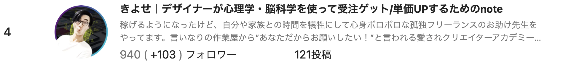 きよせさんも、時間がある時は自在にフォロワーを増やせるコツを掴まれています。ただ、他のメディアからのアクセス流入を使わずに1日100フォロワー増は、本当に素晴らしい!僕も達成した事がありません。卓越したマーケティングスキルと実績を既にお持ちなので、記事のタイトル選定の良さも効いていると思います。(noteは24時間で最大100フォローまでとなっています。)
