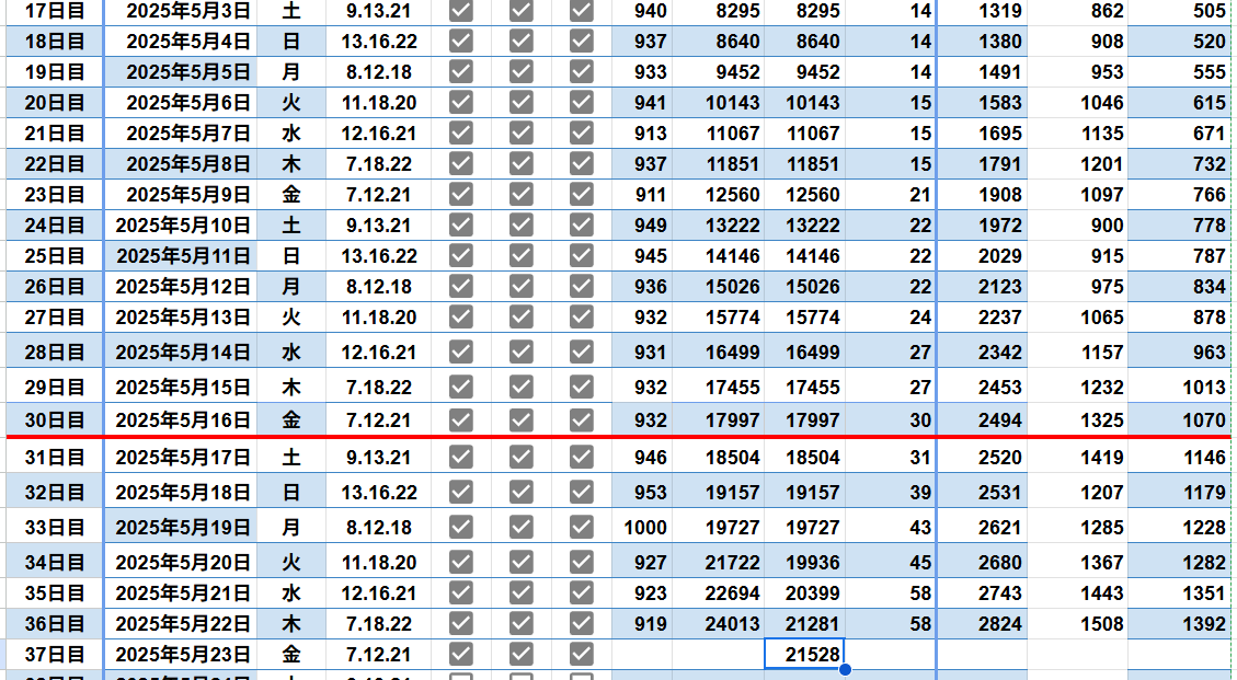 noteフォロワー急上昇ランキングでも常連となり、自分次第で20名〜80名のフォロワー増は調整できる状態だと思います。また、講義ページ内からダウンロードできるスプレッドシートとは別途、独自に作成して毎日記録をつけて下さいました。モジーさんの記録の共有は、この状態に着実にたどり着ける事を示してくれるデータとなりました。
