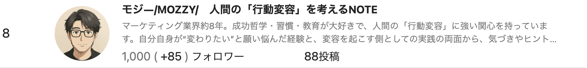 伴走メンバー男性1号だったモジーさん。最初こそビュー数やフォロワー数の伸びが緩やかだったのですが、記事投稿の効率化は1番早かったのもモジーさんでした。運用のコツ(特にフォロワー増)を掴まれてからからの伸び具合が素晴らしかったです。運用37日目に、僕の数字を超えた形になります。